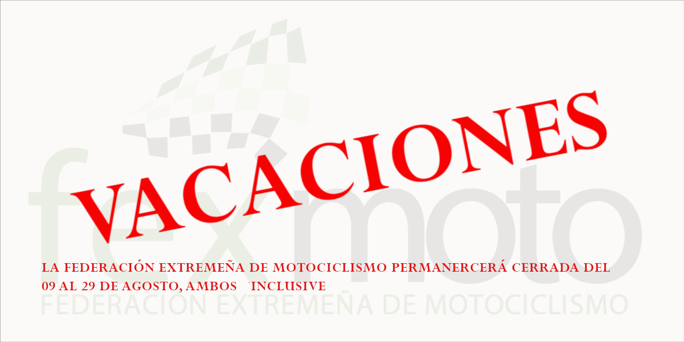 Ago82021FEXMOTO La Federación Extremeña de Motociclismo permanecerá cerrada del 09 al 29 de agosto, ambos inclusive, por vacaciones. Categoría: FEXMOTOPor fexmotoagosto 8, 2021 Share this post Share on XShare on X Navegación entre publicacionesAnteriorPublicación anterior:Ayuntamiento de Cáceres. Convocatoria de ayudas para Proyectos desarrollados por Entidades Juveniles 2021.SiguientePublicación siguiente:Resultados de los pilotos extremeños en el Mx nocturno de Almonte (Huelva)Related postsLa Selección Extremeña de Motocross, defenderá los colores de su Bandera en las Autonomías 2025.octubre 28, 2025Prueba del Campeonato de España de Motocross de las Autonomías en Mérida, circuito Vía de la Plata-Royanejos, el 01 y 02 de noviembre.octubre 24, 2025Prueba del Campeonato de Extremadura de Motocross en Talavera de la Reina, conjunta con FCMM, se celebrará el 16 de noviembre, circuito Cerro Negro.octubre 16, 2025La Prueba del Cross Country de Cañamero tras confirmación del Motoclub queda suspendida.octubre 15, 2025Presentamos la Selección Extremeña de Trial, nos representarán en el Campeonato de España de las Autonomías en Osuna el 12 de octubre.octubre 8, 2025Prueba del Campeonato de Extremadura de Motocross en Talavera de la Reina, conjunta con la Federación Castellano Manchega de Motociclismo, el día 05 de octubre.septiembre 22, 2025
