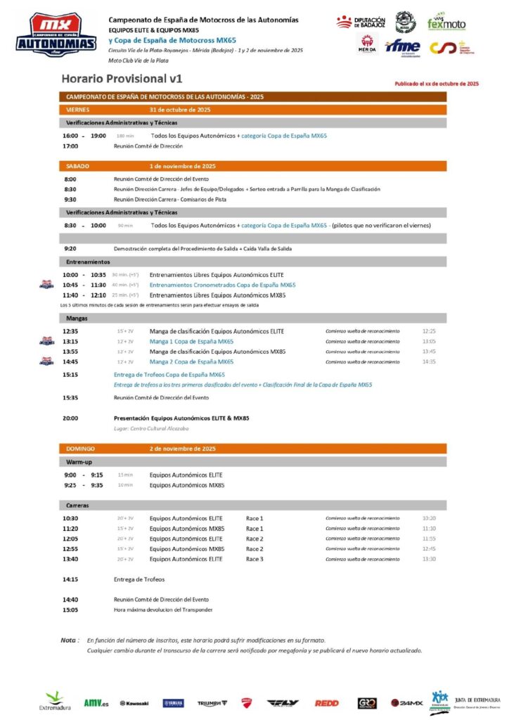 Oct242025FEXMOTO Categoría: FEXMOTOPor fexmotooctubre 24, 2025 Share this post Share on XShare on X Navegación entre publicacionesAnteriorPublicación anterior:Prueba del Campeonato de Extremadura de Motocross en Talavera de la Reina, conjunta con FCMM, se celebrará el 16 de noviembre, circuito Cerro Negro.SiguientePublicación siguiente:La Selección Extremeña de Motocross, defenderá los colores de su Bandera en las Autonomías 2025.Related postsPrueba del Campeonato de Extremadura de Trial en Navalmoral de la Mata el 23 de noviembre.noviembre 17, 2025A pilotos inscritos en el MX de Talavera – 16 de noviembre. La Prueba queda SUSPENDIDA por las condiciones meteorológicas.noviembre 14, 2025Prueba del Campeonato de Extremadura de Enduro en Miajadas, el 30 de noviembre.noviembre 10, 2025Prueba del Campeonato de Extremadura de Cross Country en Jerez de los Caballeros, el 16 de noviembre.noviembre 10, 20254ª Prueba del Campeonato de Extremadura de Trial en Talaveruela de la Vera, el día 09 de noviembrenoviembre 4, 2025La Federación Extremeña de Motociclismo permanecerá cerrada el jueves 30, el viernes 31 de octubre y el 03 de noviembre por asuntos propios del personal.octubre 30, 2025